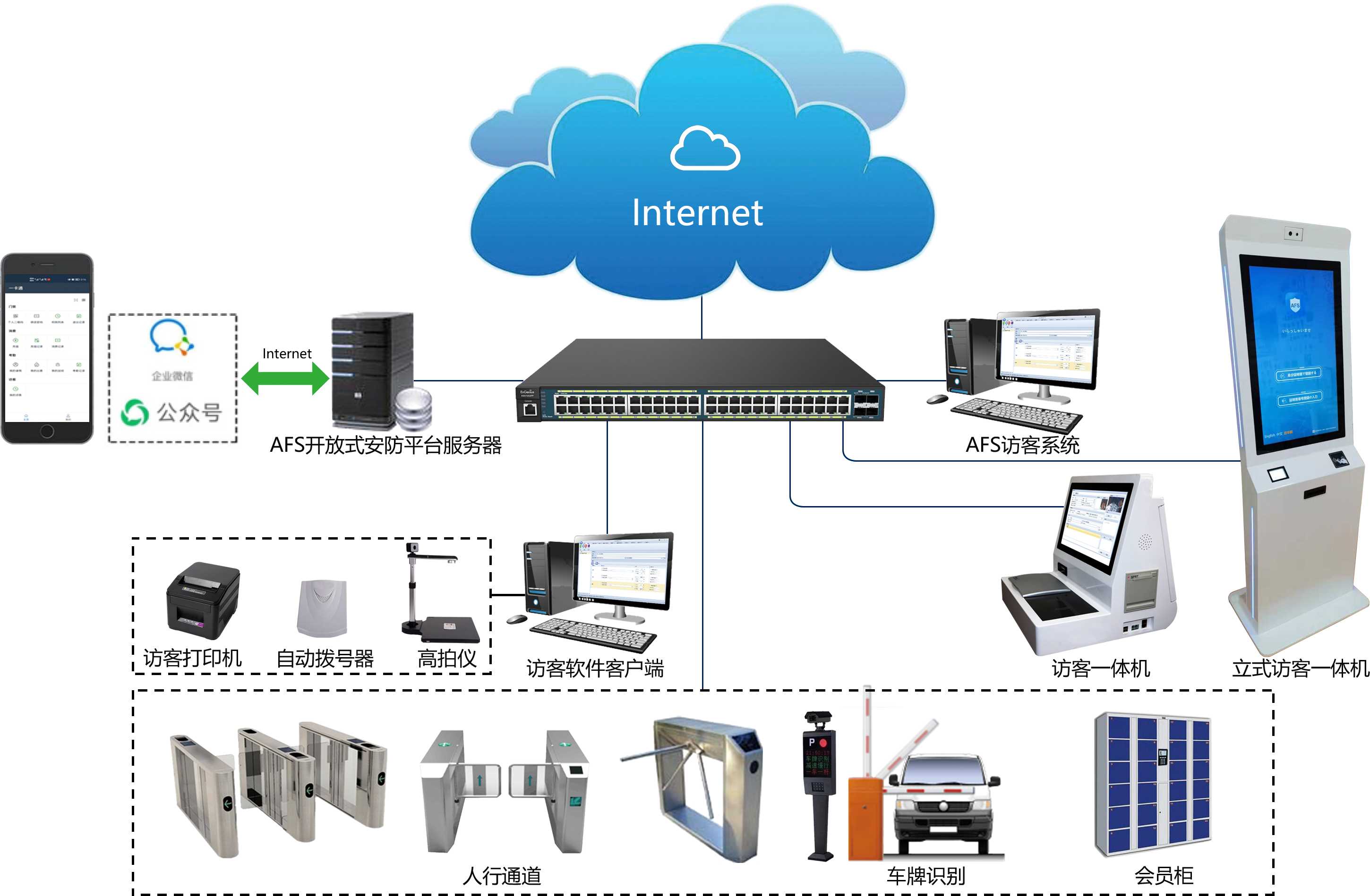 随着社会经济的快速发展及融合,各种外来人员流动性的日益频繁,增加了安全隐患。为此善一智能推出了访客管理系统,加强外来人员管理,防止安全事故发生。 传统的访客系统可能存在什么问题: (1)访客信息完全依靠手工登记,效率低,数据不易长期存档保留; (2)访客信息无法验证真实性,不能很好管控访客登记流程; (3)访客系统无法和门禁、停车场、智能柜等其他系统联动; (4)访客只能通过现场预约登记,无法使用手机APP、微信公众号等方式预约。 存在以上问题可能对客户造成什么影响? (1)手工纸质登记,访客记录长期存档,需要查询某时段的访客记录比较麻烦; (2)访客信息真实性,没有通过设备进行人证比对验证,人工确认可能出现纰漏; (3)无法与其他子系统联动,访客通行、停车、储物都比较麻烦,数据信息无法关联,查询数据麻烦,难以进行数据分析; (4)若能通过手机APP或微信公众号进行访客预约,访客可预约成功后再出发,提高出行效率,避免到现场预约未成功,耽误时间。 AFS访客系统是如何做的? 1.访客系统组网图 2.访客管理系统简介 (1)AFS访客管理系统有两种管理方式:人工辅助管理模式和自助访客登记模式; (2)人工辅助管理模式:人工辅助访客主要是通过操作员协助来宾办理访客登记业务,完成基本信息录入、信息核对、卡片(条码/二维码)发放、访客单打印、权限下载(通道、门禁、电梯等)。当访客拜访结束时,可以由被访者在来访单上签字确认拜访结束。访客凭借签过字的来访单在门卫访客登记处刷条形码或者输入访单号进行消除权限等。同时将此次来访记录进数据库,以备查用; (3)自助访客登记模式:自助访客由来宾通过自助访客终端完成来访登记业务,方便简单的操作模式,只需通过刷二代身份证及填写简单的相关信息,就能快速完成相关操作,节省专门的操作人员,来宾结束访问归还卡、访客单,由操作员进行访客注销操作。 3.访客管理系统特性 (1)支持APP、微信公众号、企业微信的访客预约,获取访客二维码,通过扫码读卡器扫码开门; (2)可读取二代身份证,自动填写访客信息; (5)支持访客单小票打印功能,可使用访客单二维码扫码开门; (9)支持多级操作员权限管理; 1.某生物制药公司访客系统,将访客来访登记信息,通过访客信息采集设备抓拍人脸照片,选择允许通行的区域,将抓拍的人脸照片自动下发到对应区域的人脸设备中,访客通过刷脸开门,访客离开权限自动移除。 2.某研发中心访客系统,将AFS系统和企业微信对接,内部员工帮访客代填访客单,信息填下完成,访客收到短息提醒,通过短信链接获取访客二维码,访客在访问时间内可通过二维码读卡器扫码通行。